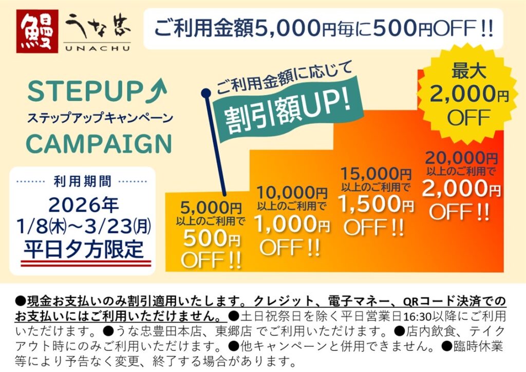 平日夕方限定!ご利用金額に応じて割引額がステップアップキャンペーン開催中です。今なら公式LINEアカウントの友だち登録をしていただいた方に、平日夕方5,000円ごとに500円OFF、最大2,000円OFFの割引クーポンを進呈しております!平日夕方はうな忠がお得!この機会に是非ご利用くださいませ。皆様のご利用お待ちしております。